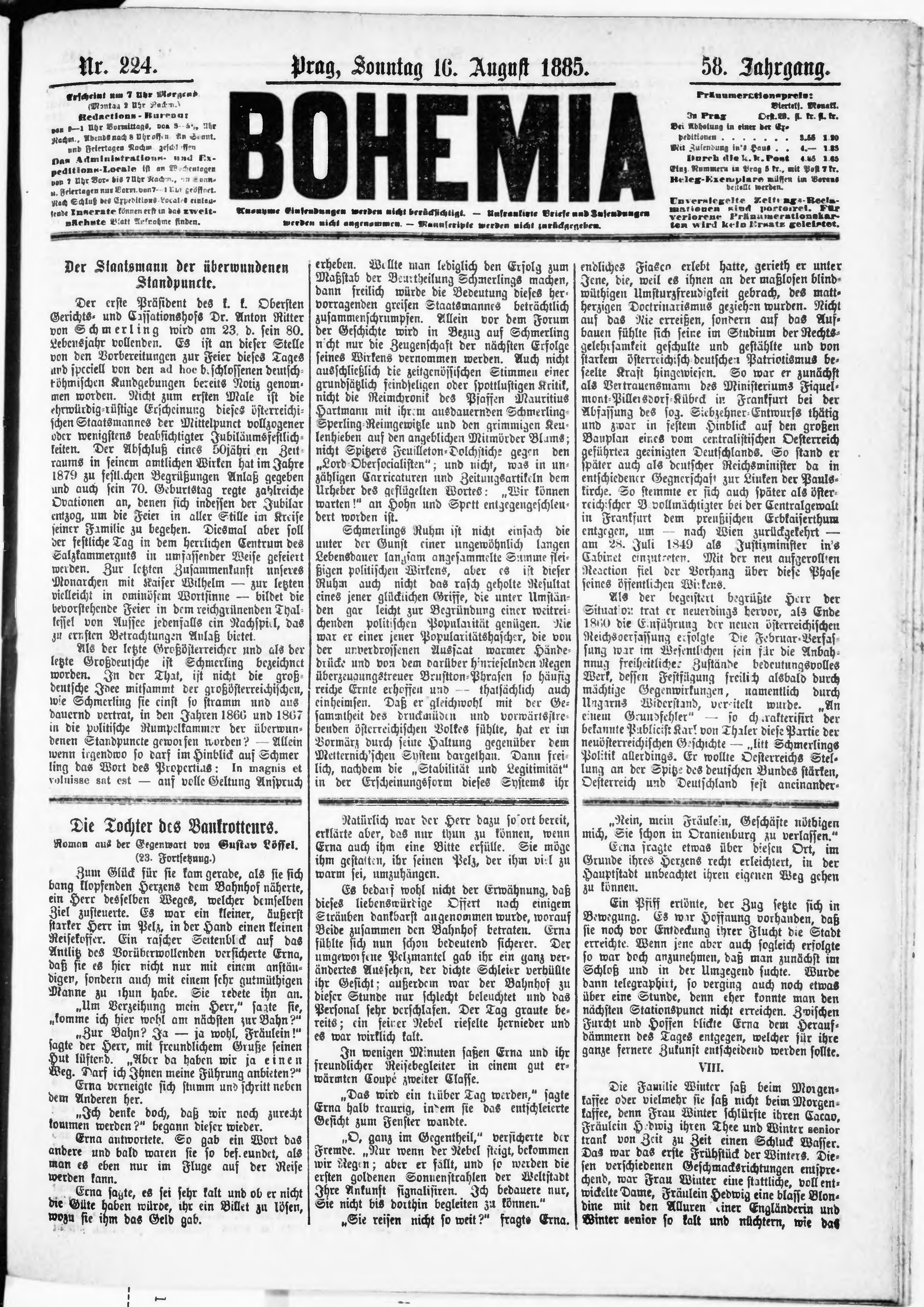 * Datum vydání výtisku: 16.8.1885 Číslo výtisku: 224