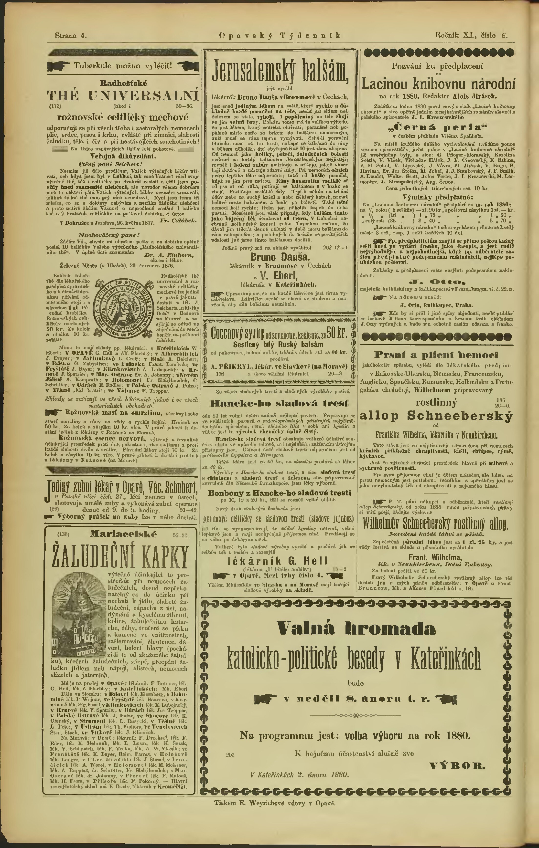 * Datum vydání výtisku: 7.2.1880 Číslo výtisku: 6