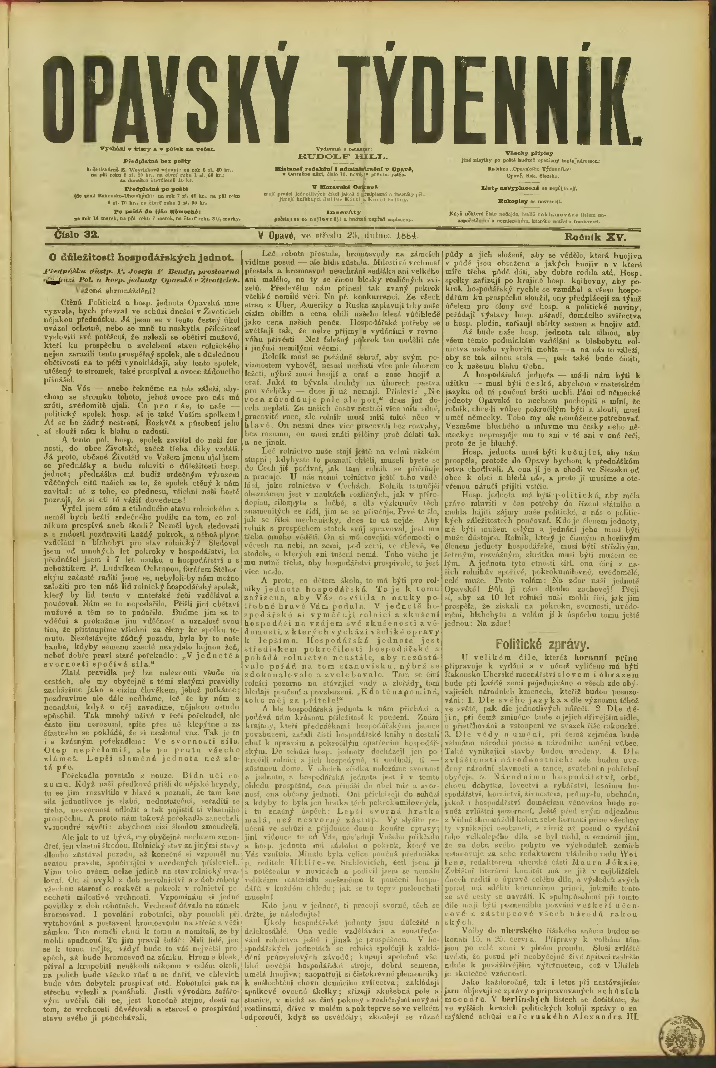 * Datum vydání výtisku: 23.4.1884 Číslo výtisku: 32