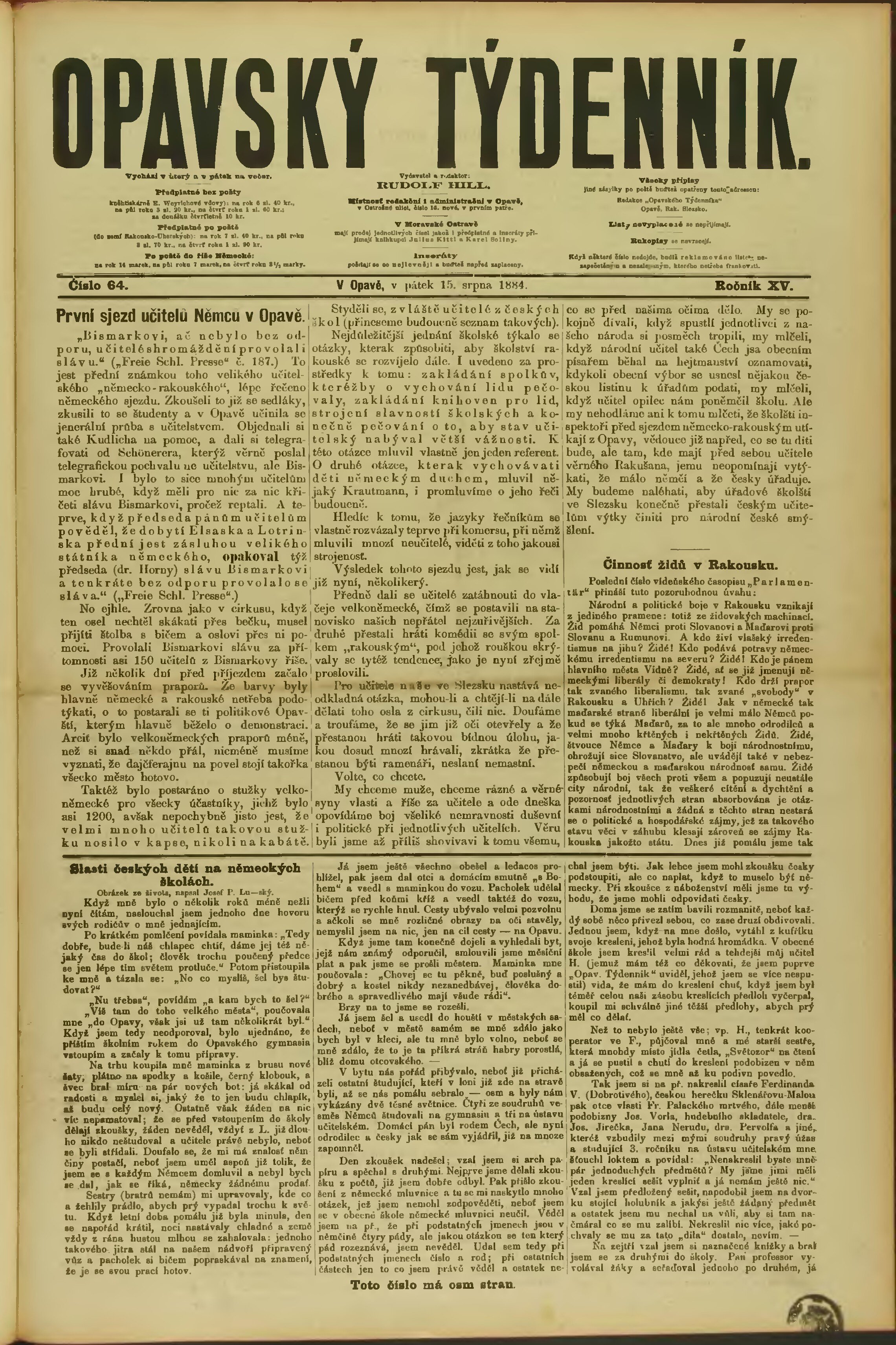 * Datum vydání výtisku: 15.8.1884 Číslo výtisku: 64