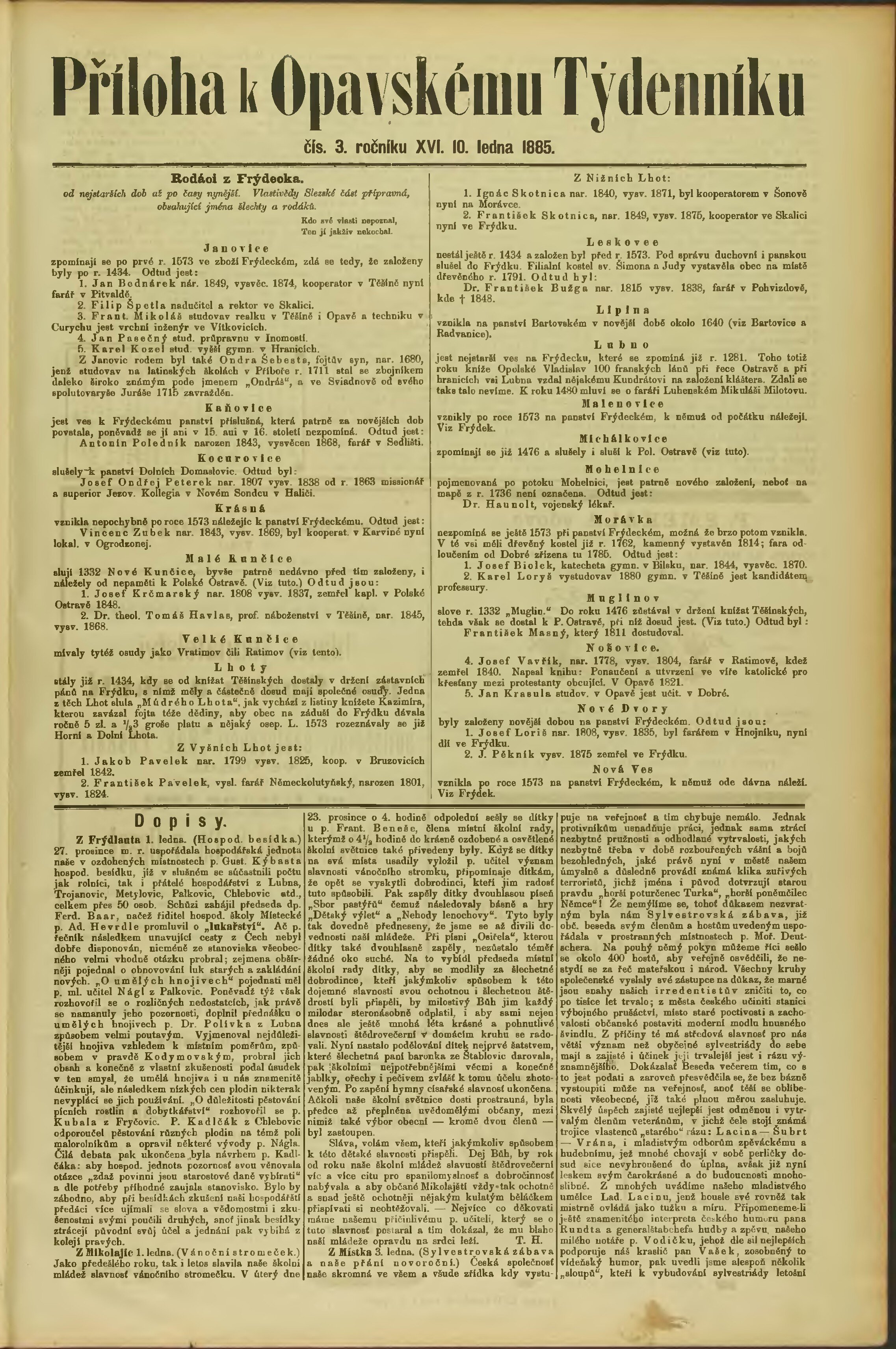 * Datum vydání výtisku: 10.1.1885 Číslo výtisku: 3 Typ výtisku: příloha