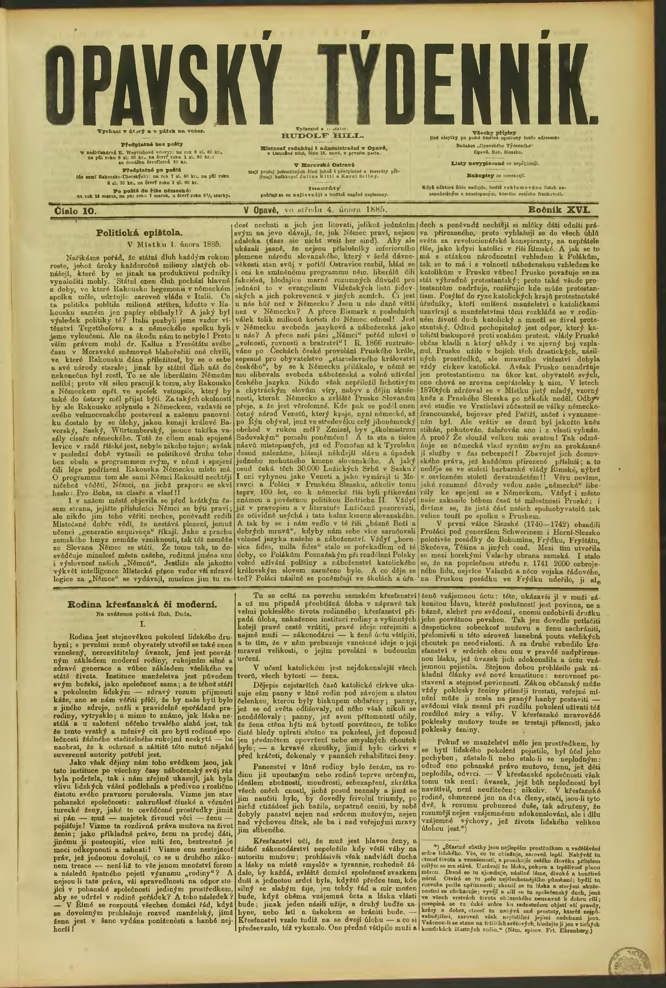 * Datum vydání výtisku: 4.2.1885 Číslo výtisku: 10