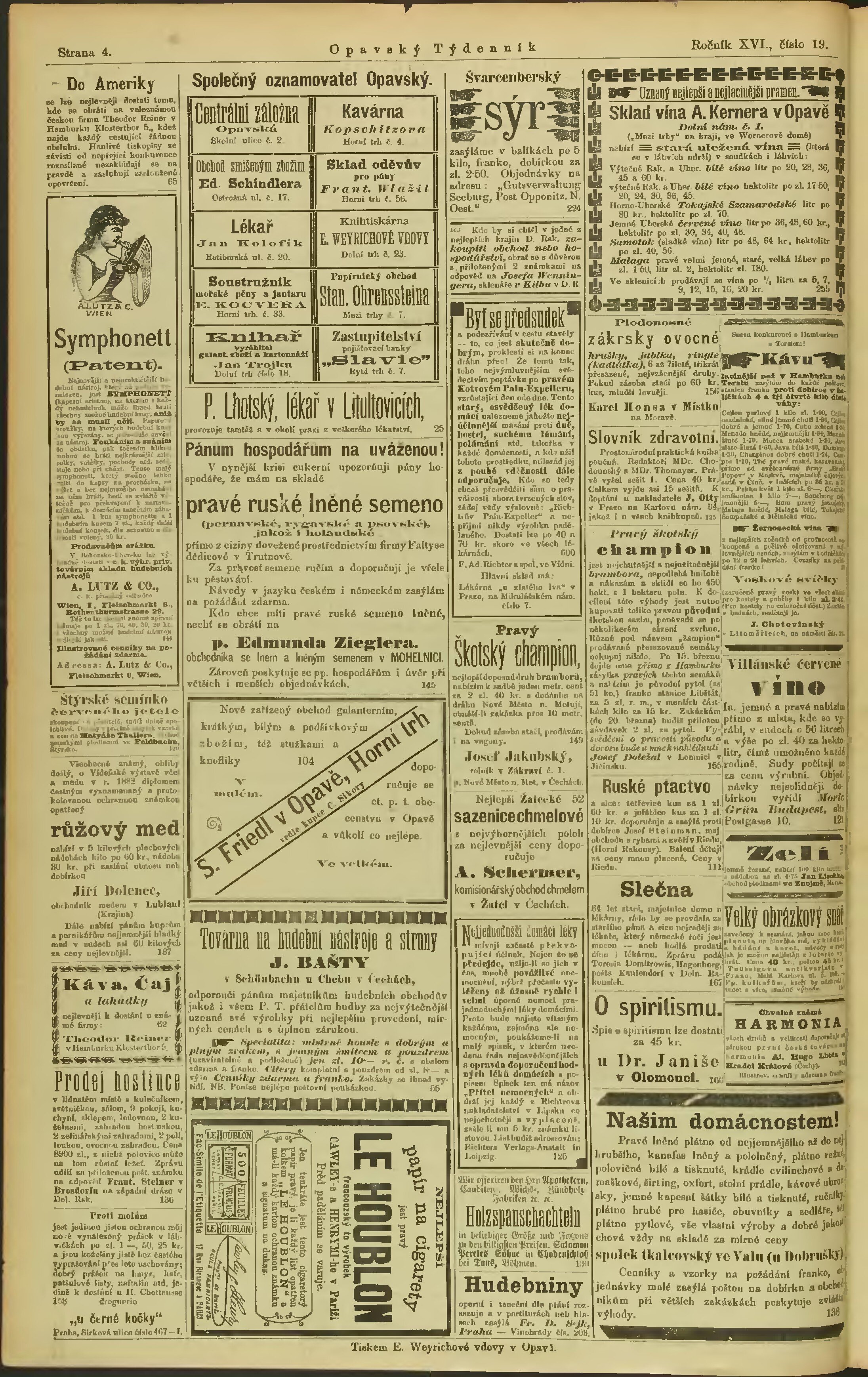 * Datum vydání výtisku: 7.3.1885 Číslo výtisku: 19