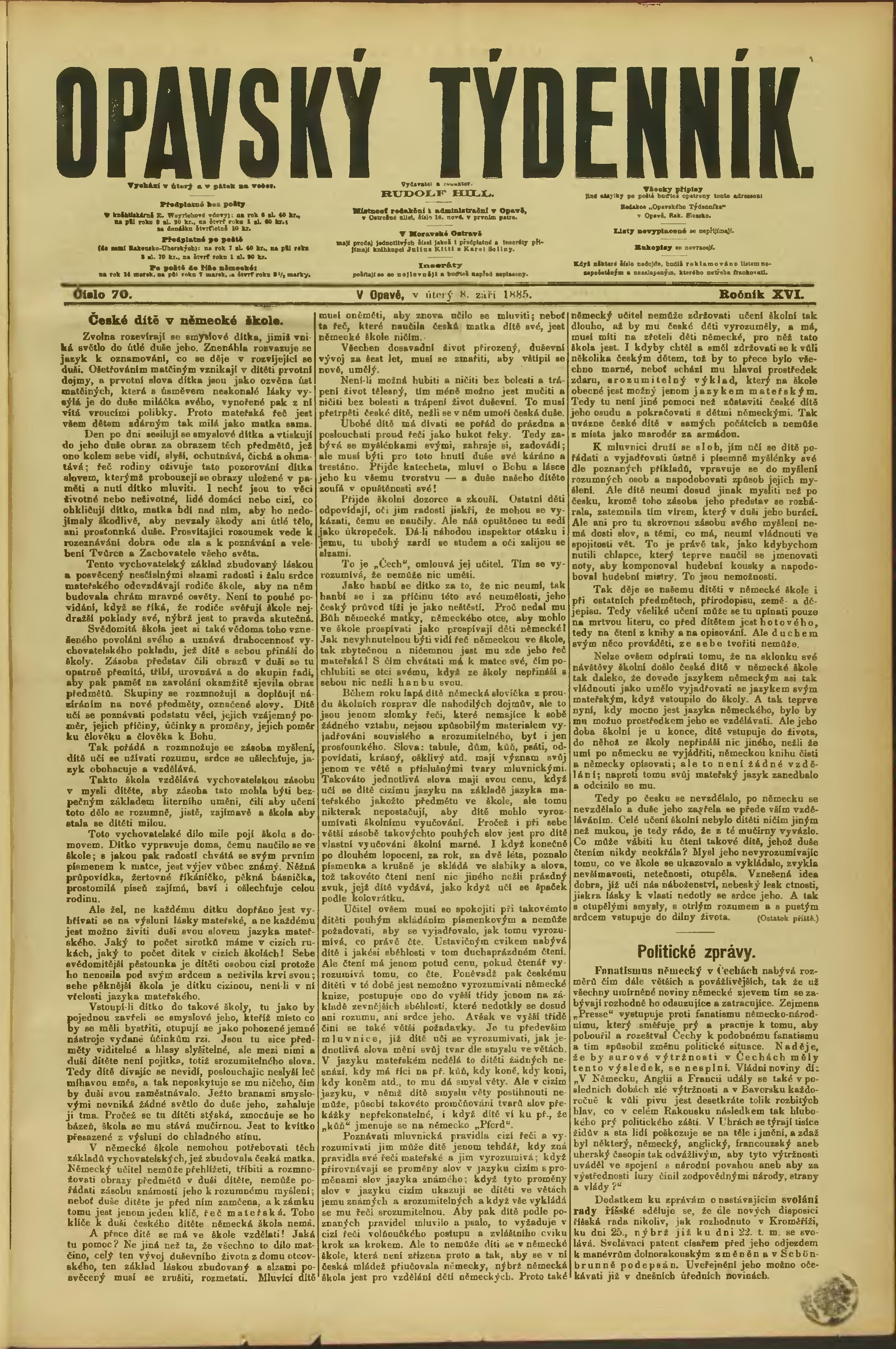 * Datum vydání výtisku: 8.9.1885 Číslo výtisku: 70