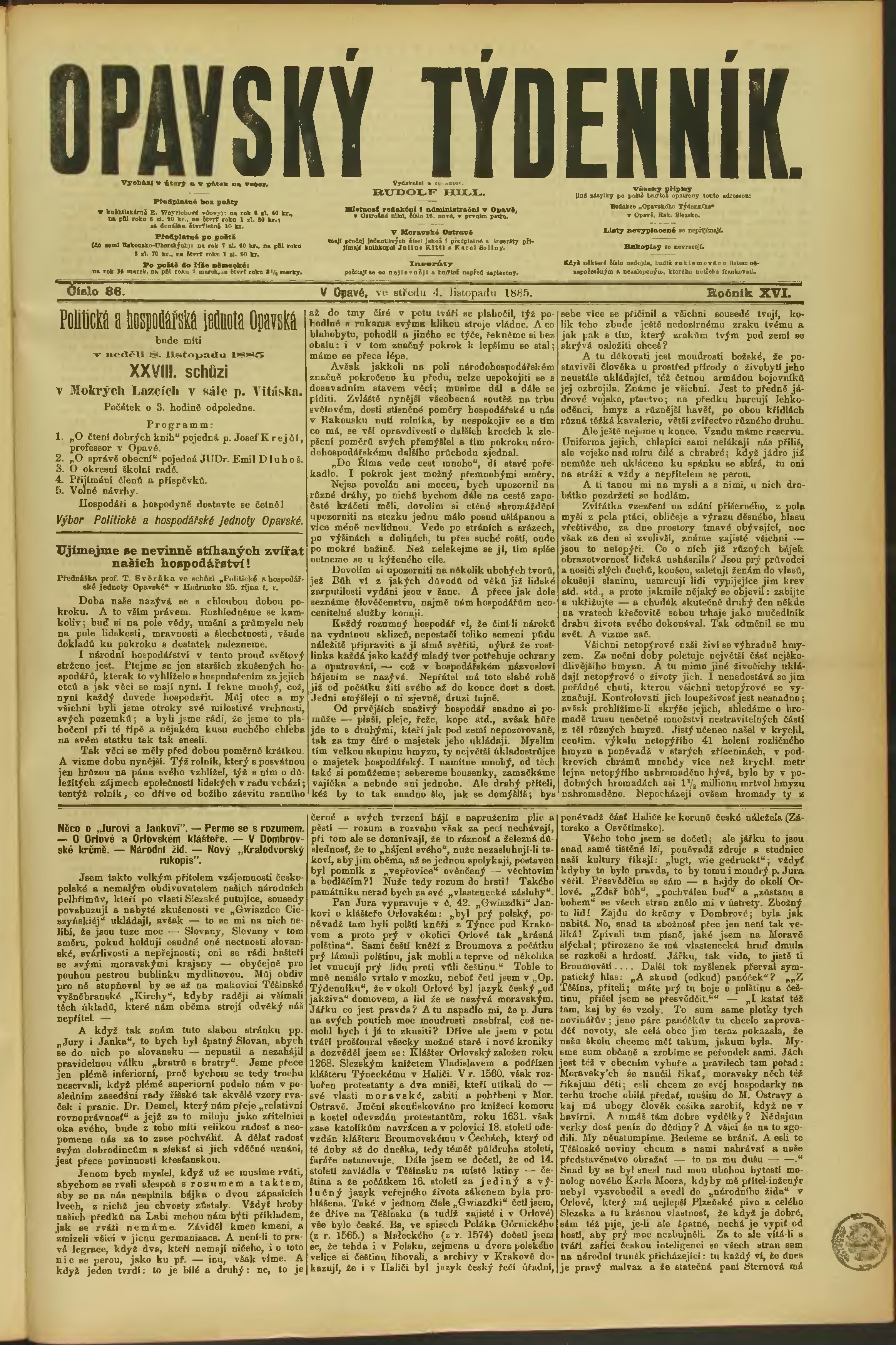 * Datum vydání výtisku: 4.11.1885 Číslo výtisku: 86