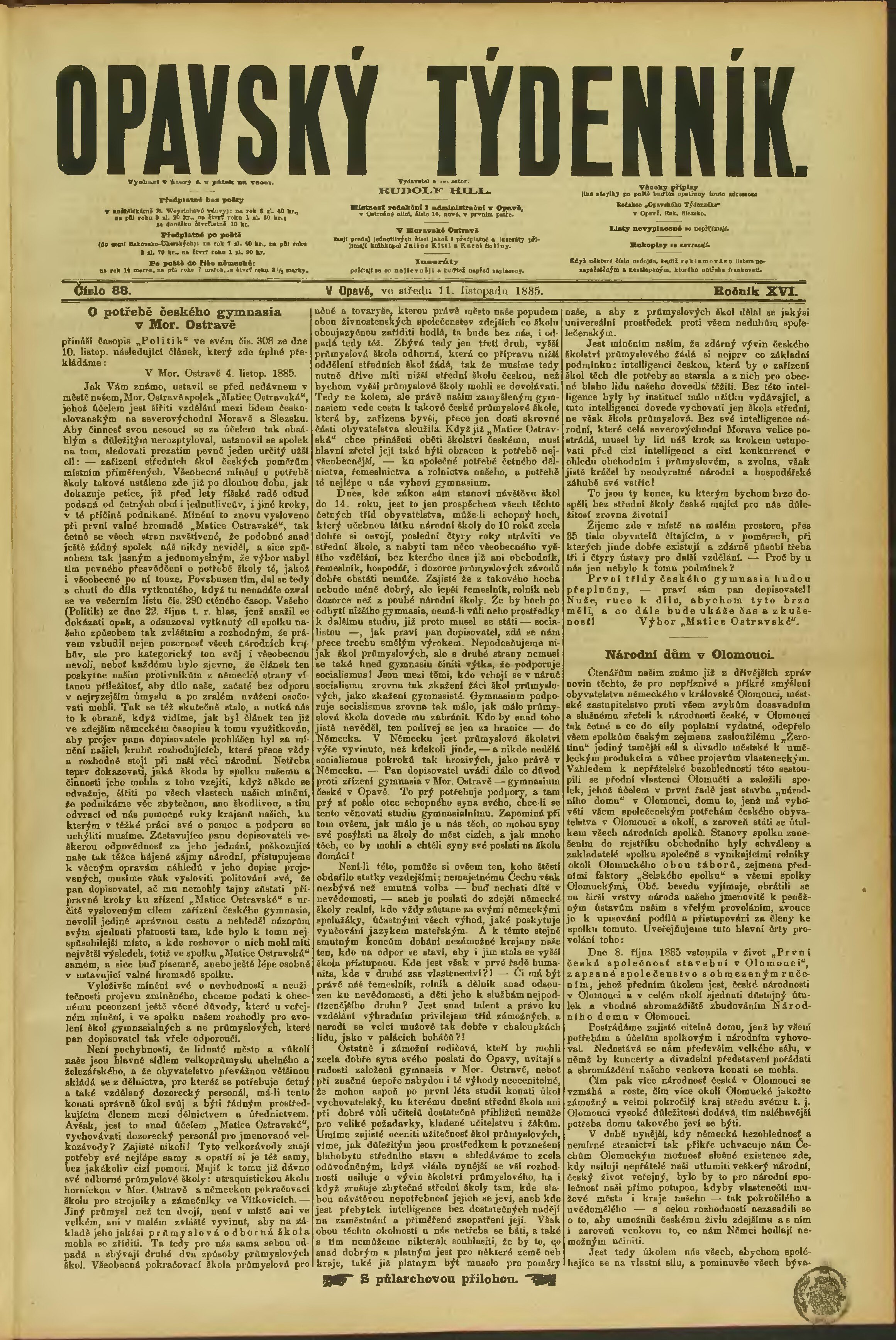 * Datum vydání výtisku: 11.11.1885 Číslo výtisku: 88