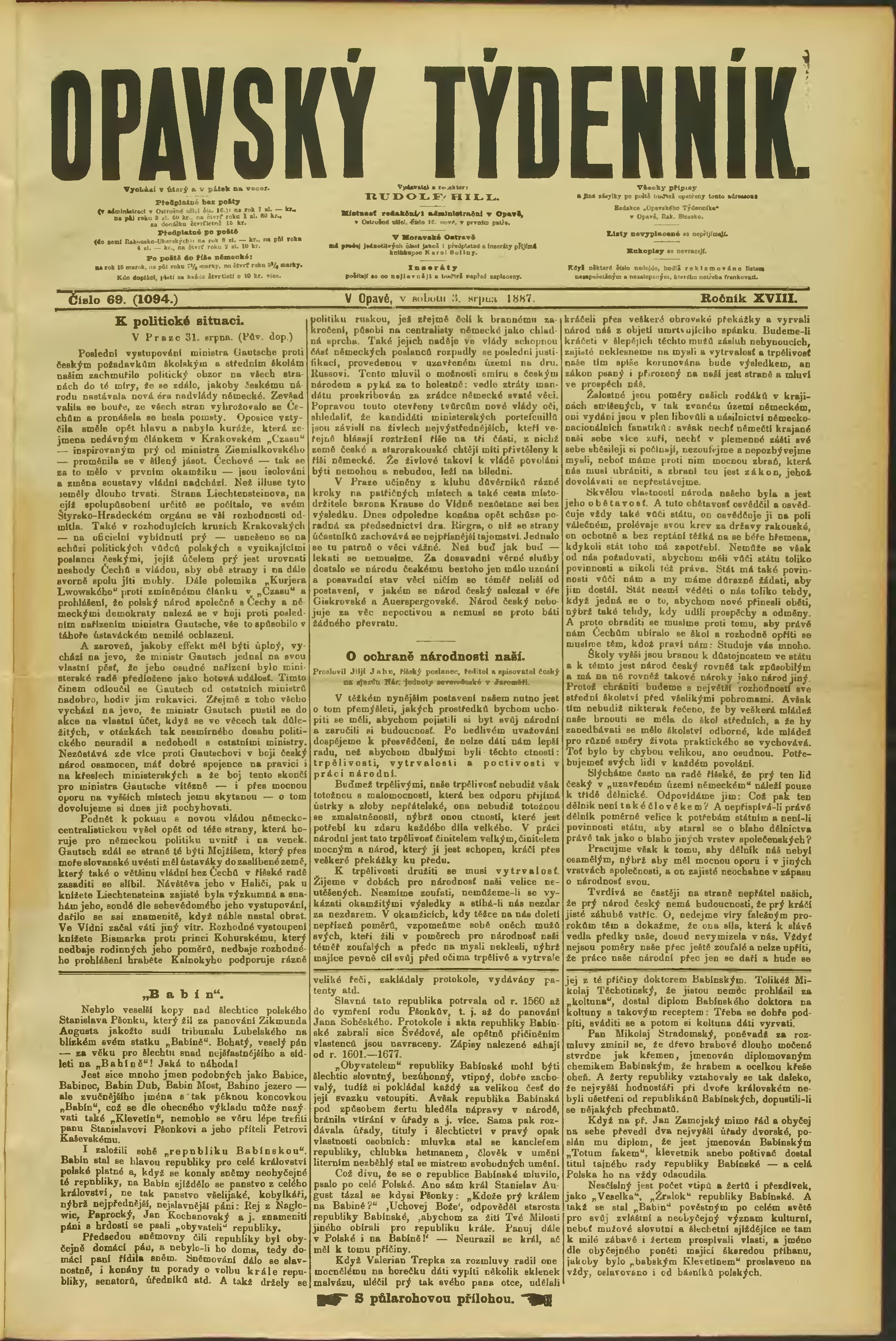 * Datum vydání výtisku: 3.9.1887 Číslo výtisku: 69 Poznámky k výtisku: chybný údaj v dataci;