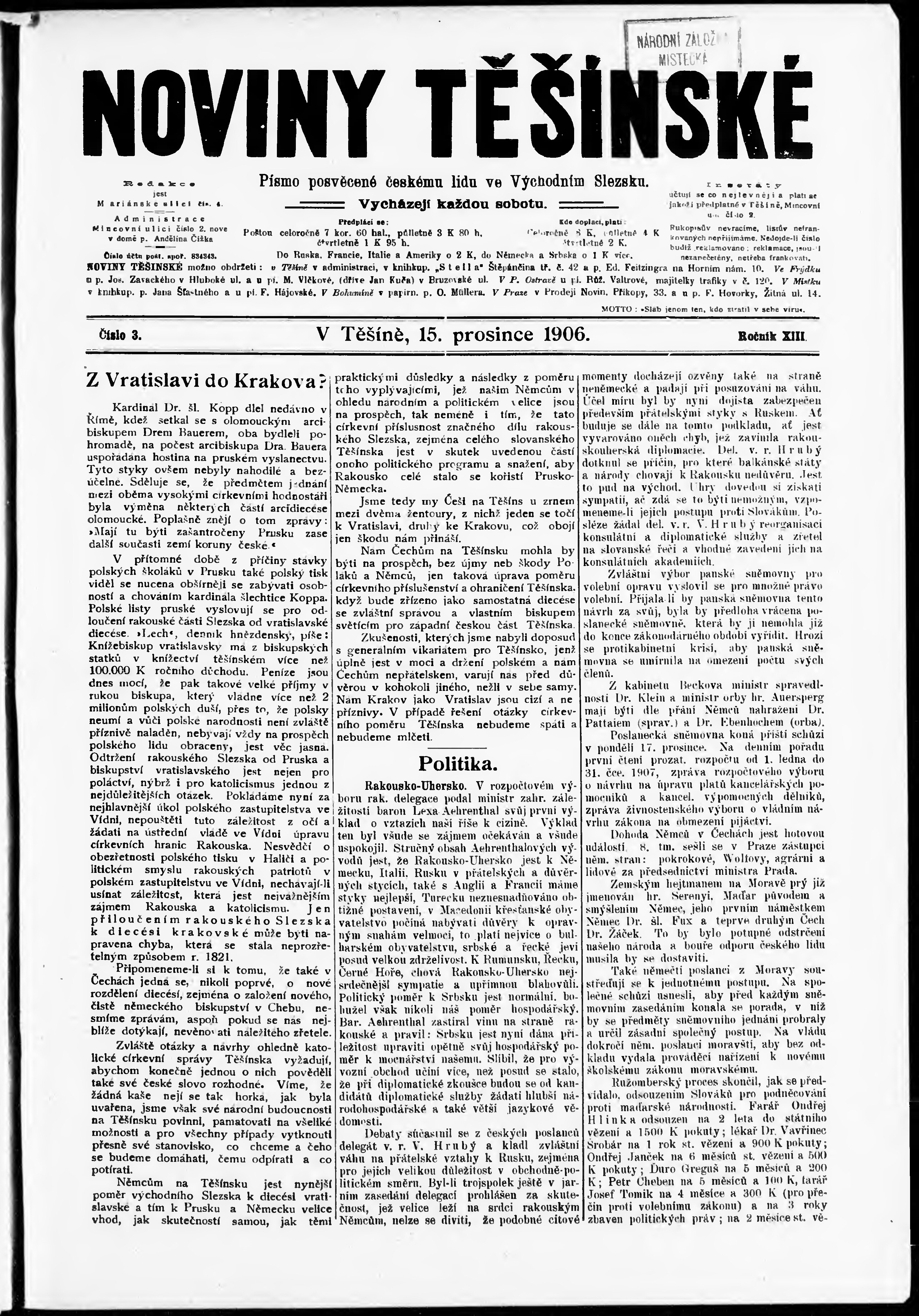 * Datum vydání výtisku: 15.12.1906 Číslo výtisku: 3