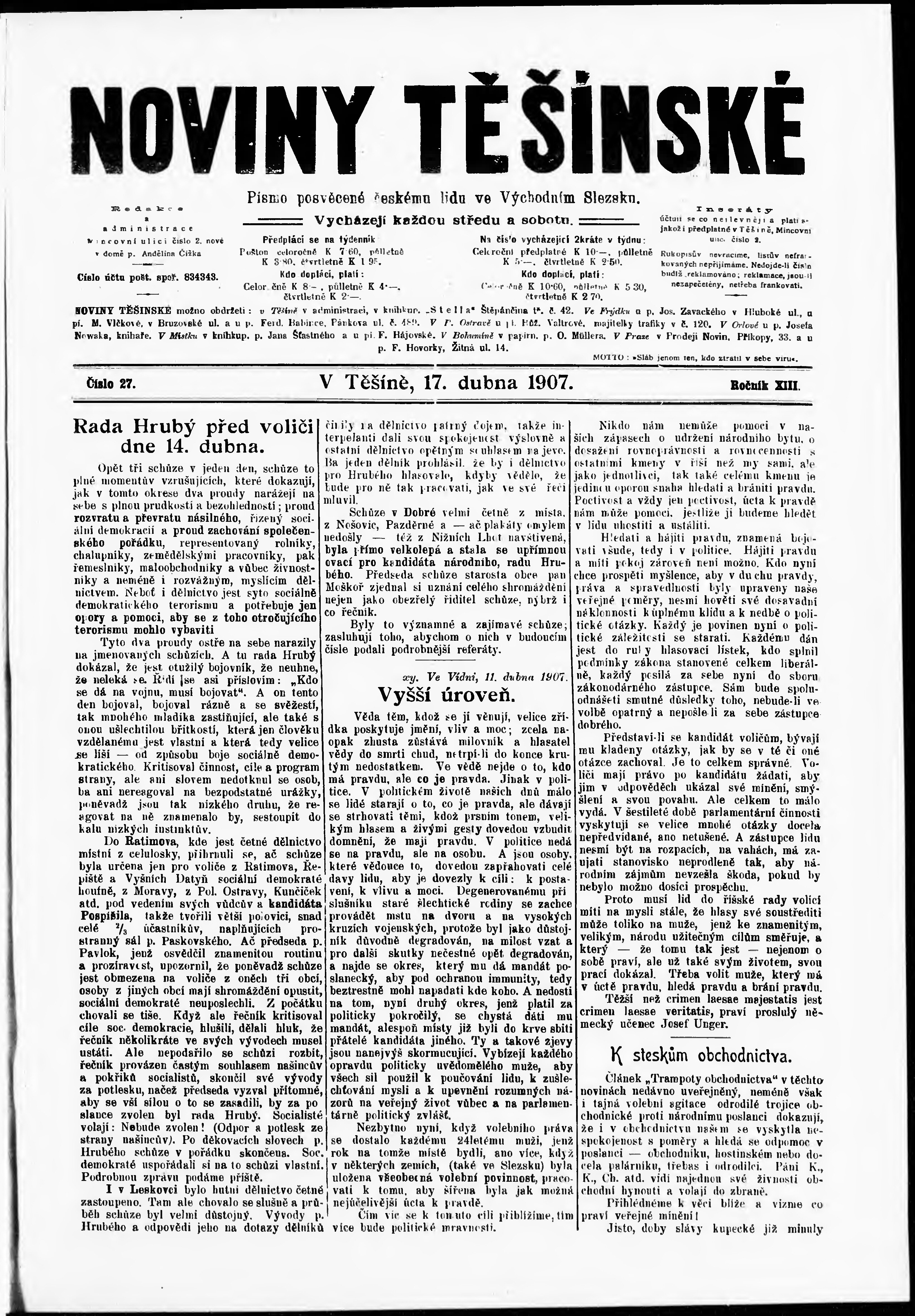 * Datum vydání výtisku: 17.4.1907 Číslo výtisku: 27