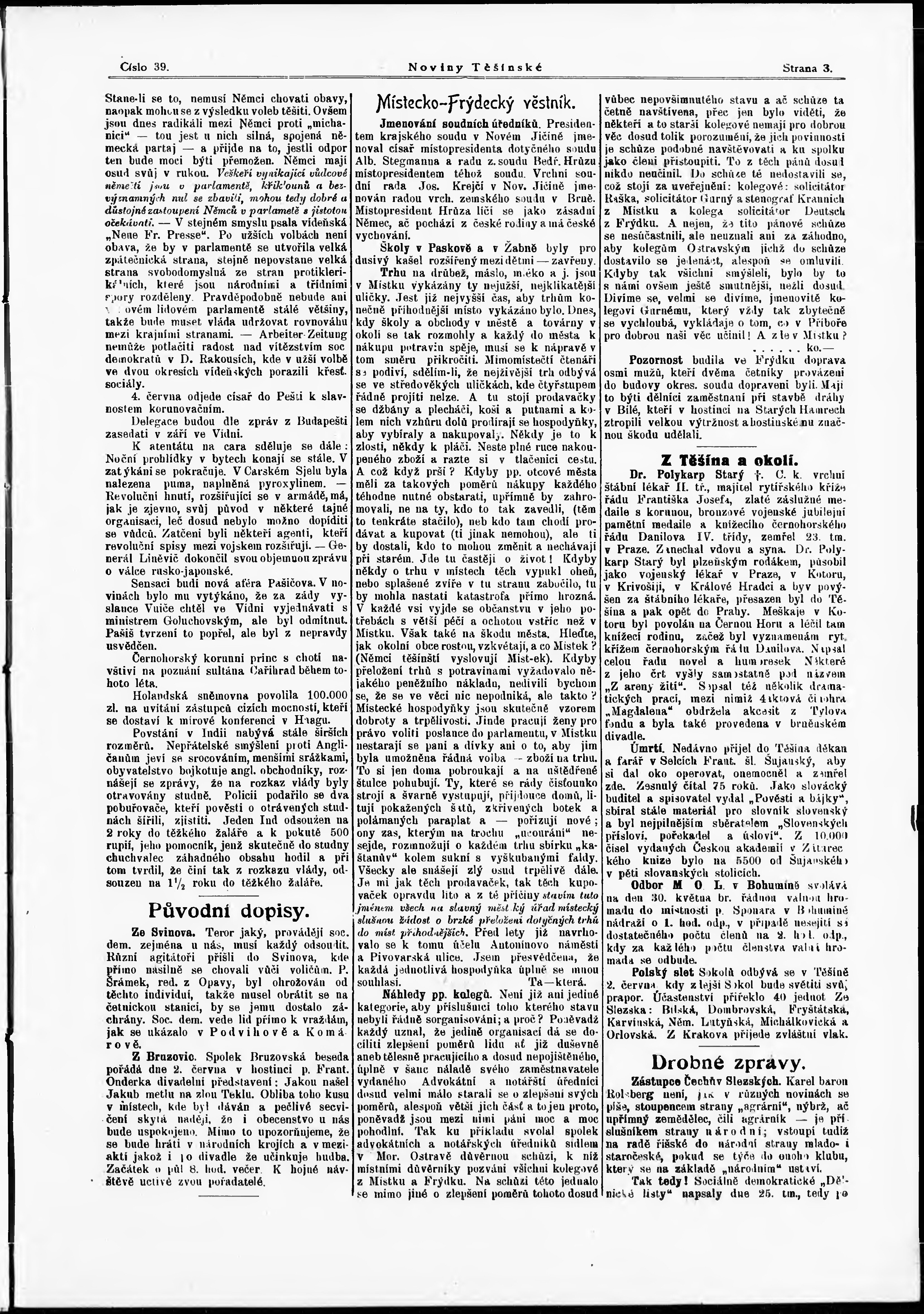 * Datum vydání výtisku: 29.5.1907 Číslo výtisku: 39