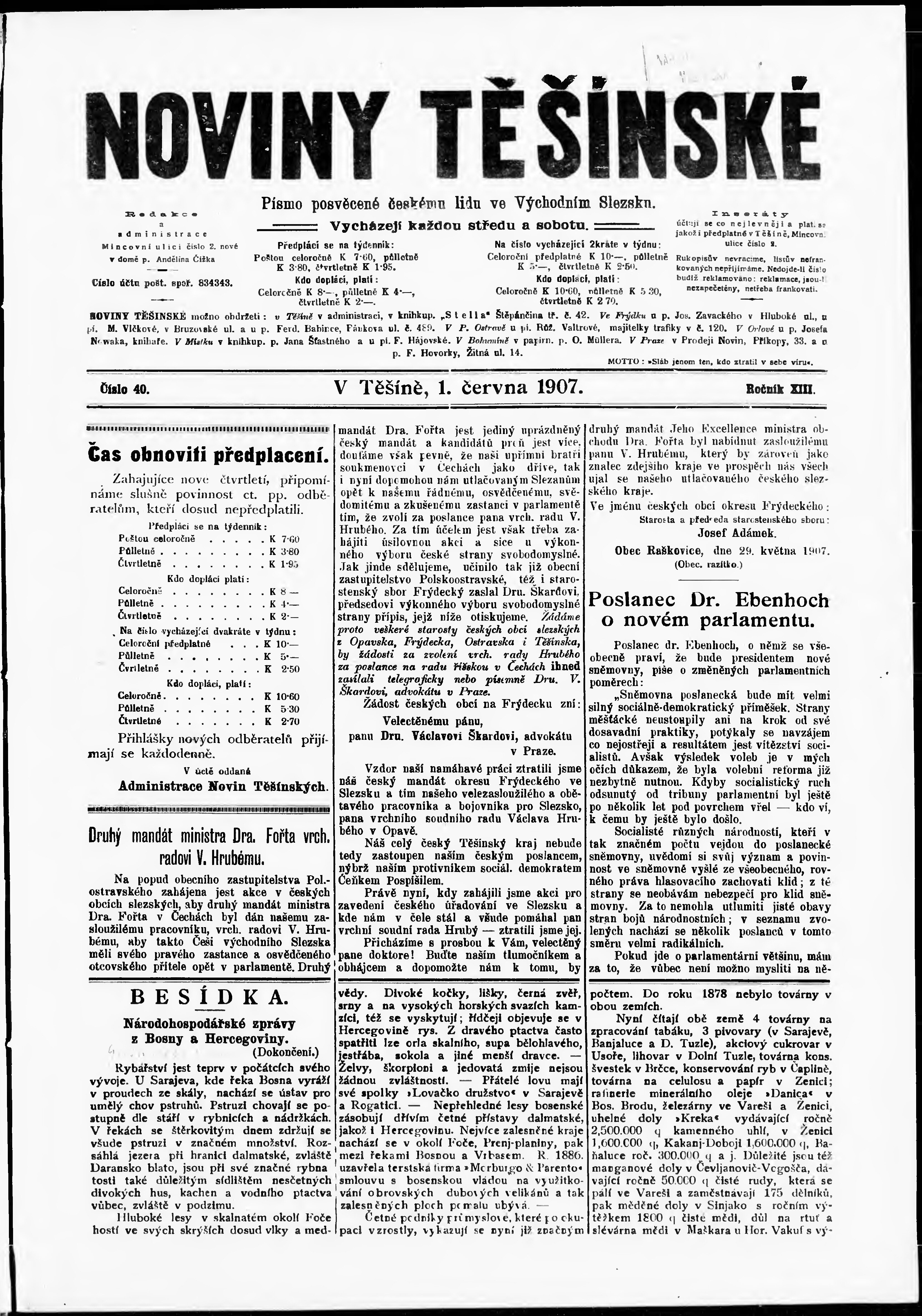 * Datum vydání výtisku: 1.6.1907 Číslo výtisku: 40