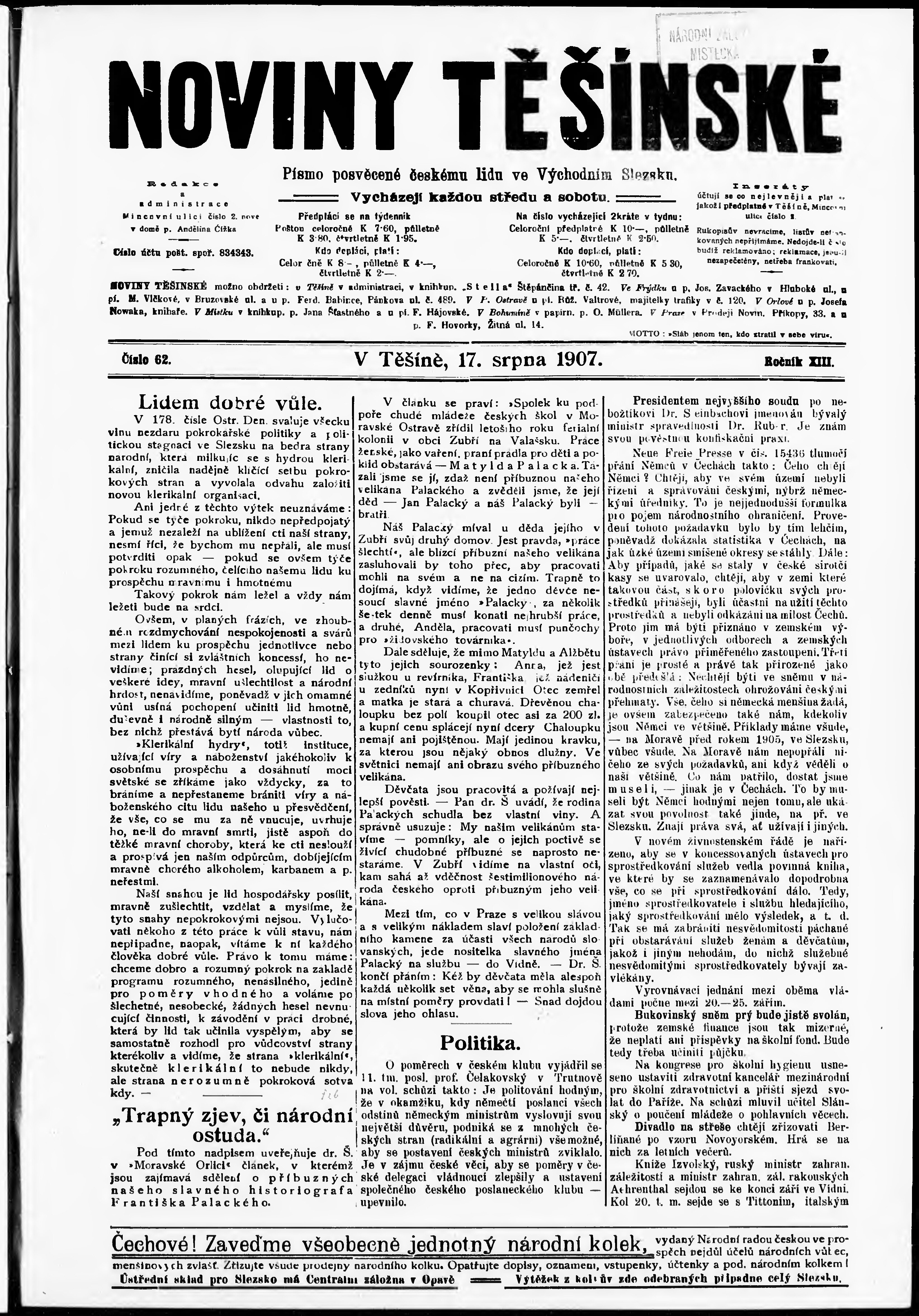 * Datum vydání výtisku: 17.8.1907 Číslo výtisku: 62