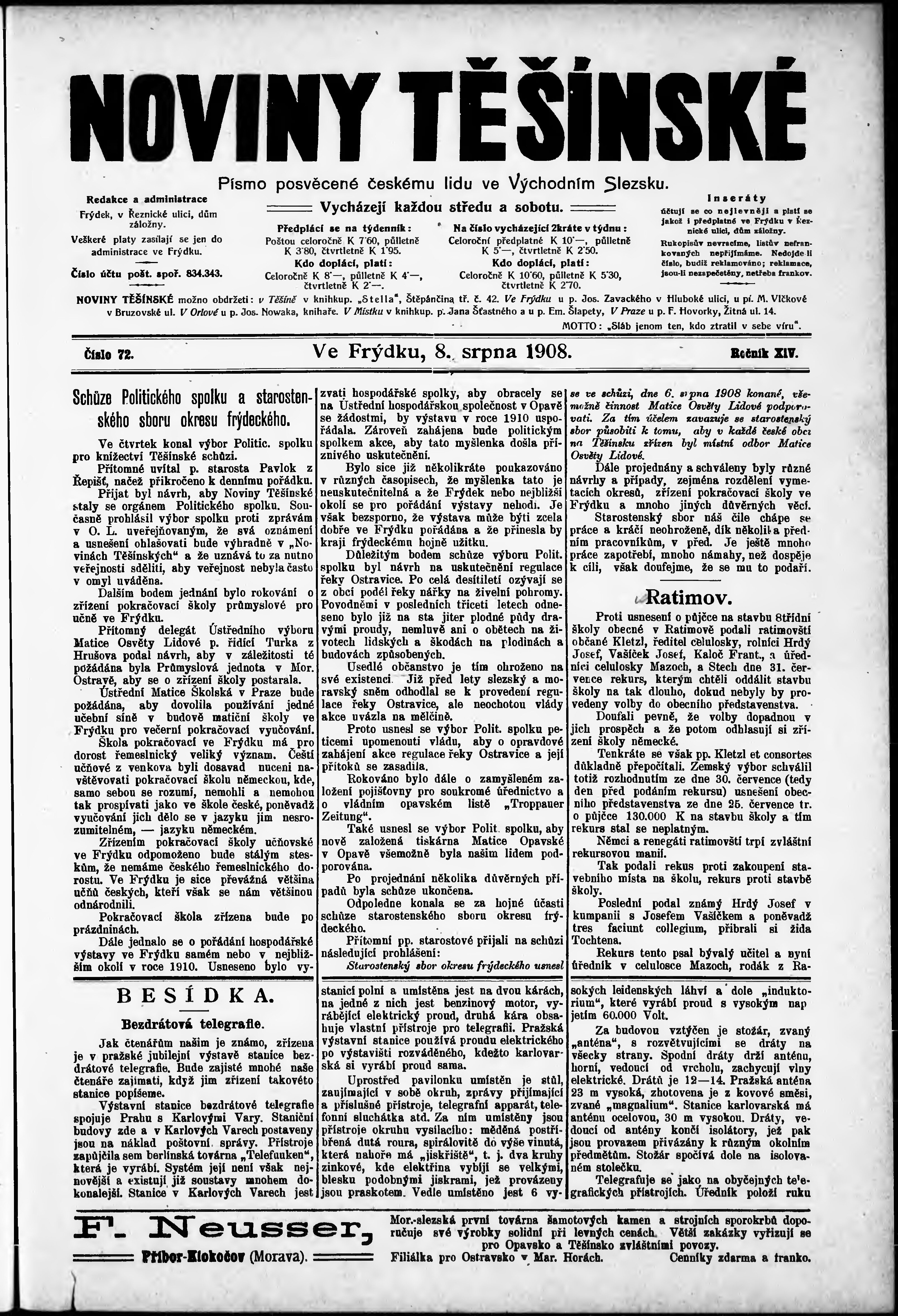 * Datum vydání výtisku: 8.8.1908 Číslo výtisku: 72