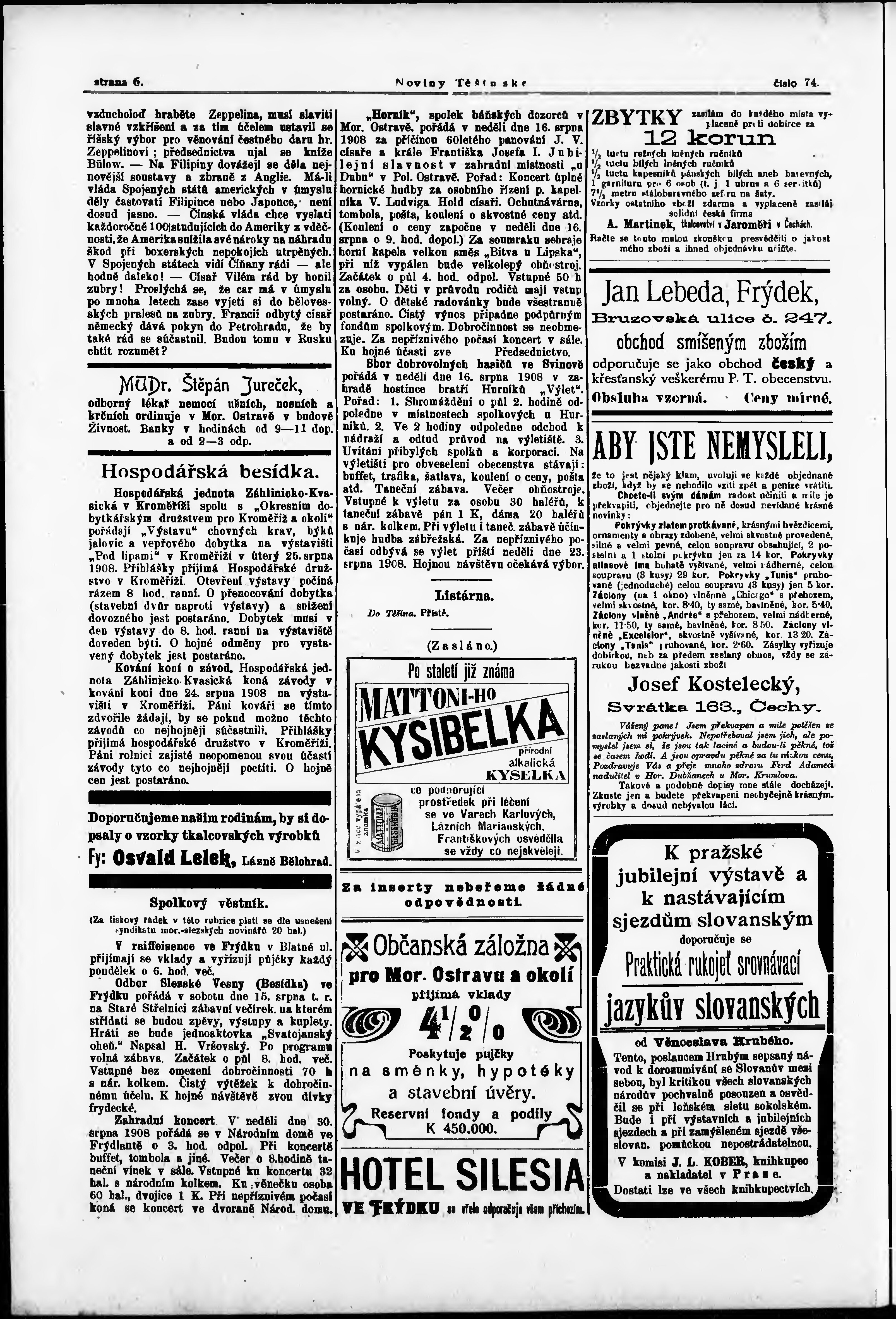 * Datum vydání výtisku: 15.8.1908 Číslo výtisku: 74